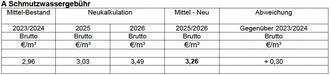 Unter Berücksichtigung der vorgenannten Sachverhalte, würde sich für das Jahr 2025 eine Schmutzwassergebühr in Höhe von 3,03 €/m³ und für das Jahr 2026 eine Schmutzwassergebühr in Höhe von 3,49 €/m³ ergeben. Der Mittelwert liegt bei 3,26 €/m³ (brutto).