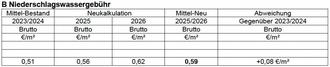 Unter Berücksichtigung der vorgenannten Sachverhalte, würde sich für das Jahr 2025 eine Niederschlagswassergebühr in Höhe von 0,56 €/m² und für das Jahr 2026 eine Niederschlagswassergebühr in Höhe von 0,62 €/m² ergeben. Der Mittelwert liegt bei 0,59 €/m² (brutto).