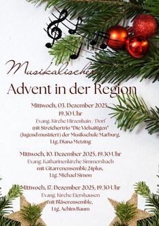 | 19.30 Uhr | Dritte gemeinsame Adventsandacht für die Region mit Pfarrer Michael Brück und dem Bläserensemble unter der Leitung von Achim Baum in der Ev. Kirche Eiershausen |