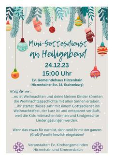 | 16.00 Uhr | Gottesdienst zum Heiligabend mit Krippenspiel des KiGos, Ev. Kirche Hirzenhain/Dorf (Pfr. Michael Brück & KiGo-Team) |