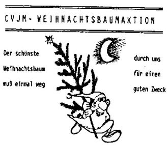 | 10.00 Uhr | CVJM-Weihnachtsbaumaktion: gegen eine Spende sammeln wir die Weihnachtsbäume ein, bitte sichtbar an die Straße stellen! |