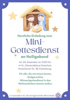 | 15.00 Uhr | Mini-Gottesdienst im Ev. Gemeindehaus Hirzenhain mit Judith Klein und Team. Für alle, die mit einem kurzen, kindgerechten Mittmachgottesdienst in das Weihnachtsfest starten wollen |