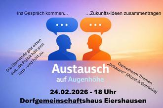 Miteinander über die gemeinsame Zukunft reden - darum geht es am Dienstag, den 24. Februar, um 18 Uhr, in Eiershausen, bei der Veranstaltung „Austausch auf Augenhöhe“. Begleitet vom Beratungsnetzwerk Hessen und dem Verein „Jetzt! e. V.“ soll im Dorfgemeinschaftshaus (Schwarzbachstraße 6) ein moderierter Austausch über Themen fürs Dorf stattfinden. Um hierbei Themen gemeinsam „bekauen“ zu können, wird es auch was zu essen geben (Wurst & Getränke). Devise ist: Die Gemeinde gibt einen aus, die Politik hält sich raus - und hört zu. „Projekt e. V.“ bietet Kinderbetreuung an während der Veranstaltung.