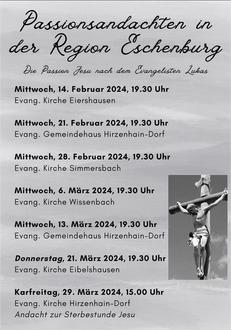 | 19.30 Uhr | Passionsandachten in der Region Eschenburg: Ev. Gemeindehaus Hirzenhain/Dorf, Pfr. Michael Brück (mit Abendmahl) |