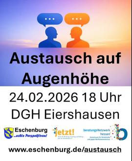 Miteinander über die gemeinsame Zukunft reden - darum geht es am Dienstag, den 24. Februar, um 18 Uhr, in Eiershausen, bei der Veranstaltung „Austausch auf Augenhöhe“. Begleitet vom Beratungsnetzwerk Hessen und dem Verein „Jetzt! e. V.“ soll im Dorfgemeinschaftshaus (Schwarzbachstraße 6) ein moderierter Austausch über Themen fürs Dorf stattfinden. Um hierbei Themen gemeinsam „bekauen“ zu können, wird es auch was zu essen geben (Wurst & Getränke). Devise ist: Die Gemeinde gibt einen aus, die Politik hält sich raus - und hört zu. „Projekt e. V.“ bietet Kinderbetreuung an während der Veranstaltung.