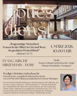 | 10.00 Uhr | Gemeinsamer Gottesdienst mit Pfarrer Michael Brück und Pastorin i.R. Christine Lieberknecht in der Ev. Kirche Hirzenhain-Dorf mit anschließendem Kirchencafe |