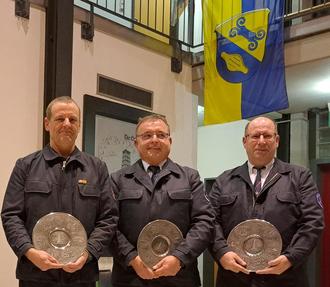 Für ihren langen und treuen Dienst gab es für die ausscheidenden Führungskräfte den Ehrenteller der Gemeinde Eschenburg, weil sie sich „in herausragender Weise für das Wohl der Gemeinde und ihrer Bürger eingesetzt haben“. Harald Hain war von 2013 an Wehrführer in Eibelshausen, davor fünf Jahre stellvertretender Wehrführer. Davor war Hain acht Jahre Gerätewart (2000 bis 2008). Jörg Waldschmidt war von 2002 bis 2010 und noch einmal von 2020 bis 2023 Wehrführer in Wissenbach. Als stellvertretender Wehrführer hatte er bereits vorher von 1992 bis 1997 und von 2000 bis 2002 Verantwortung übernommen.