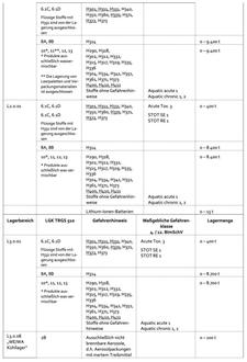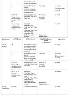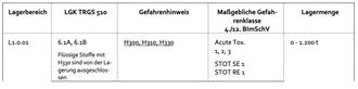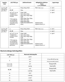 Das Lagergut (Stoffe/Gemische/Erzeugnisse) wird unter Berücksichtigung der Zusammenlagerungsverbote der TRGS 510 in den angegebenen Lagerunits des Lagergebäudes eingelagert und muss, differenziert nach Lagergut und Stoff- bzw. Stoffgruppen-Eigenschaften, folgende Lagermengen einhalten: