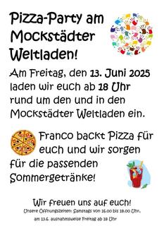 | ab 18.00 Uhr | Pizza-Party in und rund um den Mockstädter Weltladen mit Pizza von Franco und passenden Sommergetränken |