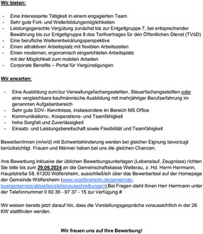 Ihre Bewerbung inklusive der üblichen Bewerbungsunterlagen (Lebenslauf, Zeugnisse) richten Sie bitte bis zum 29.06.2024 an die Gemeinschaftskasse Wetterau, z. Hd. Herrn Herrmann, Hauptstraße 58, 61200 Wölfersheim, ausschließlich über das Bewerbertool auf der Homepage der Gemeinde Wölfersheim (www.woelfersheim.de/gemeinde-