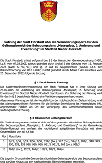 Die Stadtverordnetenversammlung der Stadt Florstadt hat in Ihrer Sitzung am 28.05.2025 die Aufstellung des Bebauungsplans „Messeplatz, 2. Änderung und Erweiterung“ im Stadtteil Nieder-Florstadt beschlossen. Zur Sicherung der Planung wird für das in § 2 bezeichnete Gebiet eine Veränderungssperre beschlossen.