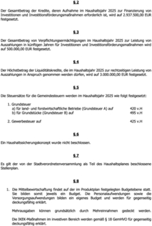 Der Gesamtbetrag der Kredite, deren Aufnahme im Haushaltsjahr 2025 zur Finanzierung von Investitionen und Investitionsförderungsmaßnahmen erforderlich ist, wird auf 2.937.500,00 EUR festgesetzt.