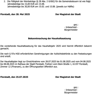 Der Haushaltsplan liegt zur Einsichtnahme vom 28.07.2025 bis 01.08.2025 und vom 04.08.2025 bis 08.08.2025 im Rathaus der Stadt Florstadt, Freiherr-vom-Stein-Straße 1, 61197 Florstadt, Zimmer 12 (Finanzen), zu den Öffnungszeiten öffentlich aus.
