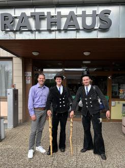 Im Rathaus begrüßte Bürgermeister Daniel Imbescheid die beiden wandernden Handwerker herzlich. Die Burschen stellten sich standesgemäß mit ihrem traditionellen Gruß vor: „Glück zu!“ – eine Begrüßung, die unter Handwerkern für Zusammenhalt und gegenseitigen Respekt steht. Sichtlich beeindruckt von ihrem Engagement und Mut, würdigte der Bürgermeister die Tradition und die Bedeutung der Walz für das Handwerk und zollte ihnen ebenfalls Respekt für ihren Mut.