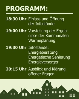 Der Abend beginnt um 18:30 Uhr mit dem Einlass und der Öffnung der Infostände. Um 19:00 Uhr folgt die Vorstellung der Ergebnisse der Kommunalen Wärmeplanung. Anschließend, ab etwa 19:30 Uhr, besteht die Möglichkeit zum Austausch mit Fachleuten aus den Bereichen Energieberatung, energetische Sanierung und Energieversorgung. Gegen 20:15 Uhr gibt es einen Ausblick auf die nächsten Schritte und Gelegenheit, offene Fragen zu klären.