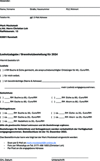 Bestellungen für Losholz und Schichtholz bei der Mark Mockstadt können mit dem beigefügten Bestellformular getätigt werden.