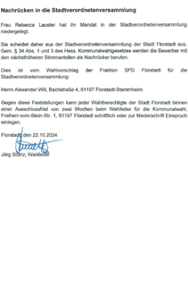 Frau Rebecca Lauster hat ihr Mandat in der Stadtverordnetenversammlung