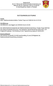 Die Ladung ist gemäß § 58 und § 7 der Hessischen Gemeindeordnung (HGO) form- und fristgerecht ergangen. Die Einladung mit der Tagesordnung erging am 28.08.2024.