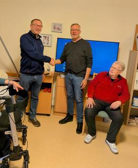 Ein Bild zeigt den Vorstand des Fördervereins mit dem 1. Vors. Joachim Gutermuth, Heimleiter Holger Wenisch, Heimbeiratsvorsitzenden Peter Fuhr sowie den Bewohner Klaus Kwiatkowski, der als erster Nutzer die neue Technik nutzt. Ein weiteres Bild zeigt den Heimleiter Holger Wenisch der sich beim 1. Vors. Joachim Gutermuth bedankt.