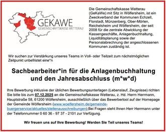 Ihre Bewerbung inklusive der üblichen Bewerbungsunterlagen (Lebenslauf, Zeugnisse) richten Sie bitte bis zum 07.12.2025 an die Gemeinschaftskasse Wetterau, z. Hd. Herrn Herrmann, Hauptstraße 58, 61200 Wölfersheim, ausschließlich über das Bewerbertool auf der Homepage der Gemeinde Wölfersheim (www.woelfersheim.de/gemeinde-buergerservice/aktuelles/stellenausschreibungen) Bei Fragen steht Ihnen Herr Herrmann unter der Telefonnummer 0 60 36 - 97 37 - 2101 zur Verfügung.