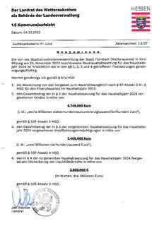 Aufgrund der §§ 94 ff. der Hessischen Gemeindeordnung (HGO) in der Fassung der Bekanntmachung vom 07. März 2005 (GVBI. S. 142), zuletzt geändert vom 16. Februar 2023 (GVBl. S. 90,93), hat die Stadtverordnetenversammlung am 22. November 2023 folgende Haushaltssatzung beschlossen: