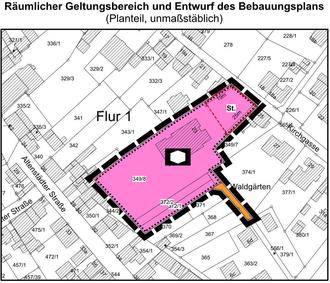 Der räumliche Lage sowie der Entwurf des Bebauungsplans gehen aus den nachstehenden Übersichtskarten hervor (jeweils fett umrandeter Bereich).