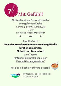 | 17:00 Uhr | Gottesdienst zur evangelischen Fastenaktion “7 Wochen ohne“: Mit Gefühl! Sieben Wochen ohne Härte |