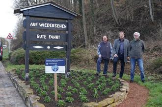 Gemeinsam mit Stefan Gries vom städtischen Gärtnerteam (links) und dem Behindertenbeauftragten Wolfgang Giffel (rechts) besuchte Bürgermeister Bernd Hertzler das Vergissmeinnicht-Beet mit dem Hinweisschild „Demenz geht uns alle an“ am Webenheimer Ortsrand.