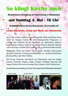 | 04.05.2024 | So klingt Kirche auch mit Andreas Vogel, Margarethe Preiß, Robert Dawo und der Gruppe Cantina in der protestantischen Kirche Blieskastel |