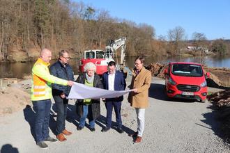 Beim Ortstermin machten sich die Verantwortlichen ein Bild über den Beginn der Bauarbeiten an der Brücke über den Weiherarm. Von links: Alexander Linz, Bürgermeister Bernd Hertzler, die stellvertretende Ortsvorsteherin Rita Kirsch, Beigeordneter Patrick Hüther und Baudezernent Tobias Kohl. (Foto: Erich Schwarz)