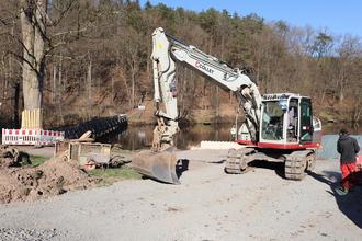 „Es geht jetzt voran und nach jetzigem Planungsstand wird die Brücke im Spätsommer fertig sein“, gibt sich Bau-Beigeordneter Patrick Hüther (CDU) optimistisch. Und auch Bürgermeister Bernd Hertzler (SPD) zeigt sich zuversichtlich: „Die Bürgerinnen und Bürger werden sehen, dass jetzt Bewegung in die Sache kommt“. Und bewegt wurde in den letzten Tagen tatsächlich schon Einiges. Die sogenannte Weiher-Halbinsel wird jetzt durch eine Baustraße in zwei Teile geteilt, und über diese Schotterstrecke sollen die schweren Maschinen und später auch die Brückenteile zur Baustelle am Weiherarm gebracht werden. Die beiden Experten vom Bauamt, Bauingenieur Alexander Linz vom Tiefbauamt und Baudezernent Tobias Kohl, sind sich sicher, dass es von nun an laufen wird: „Am Montag wird der Kran gestellt“, kann Kohl versichern. Die Arbeiter der Saarbrücker Firma haben bereits eine Ebene für den Kran vorbereitet, was nicht so ganz einfach war: „Der Untergrund ist sehr inkonsistent, das ist zum Teil sumpfig. Aber die Firma wird das schon hinkriegen“, ist sich Bauexperte Linz ganz sicher. Mit dem Kran werden dann die Pfähle für den Unterbau der Brücke in den Weiherboden gerammt. Es handelt sich wegen der Beschaffenheit des Wassers um Pfähle aus einem Spezialstahl. Ein Teil der alten Brücke bleibt während der Bauphase stehen, von dort aus wird am Aufbau der neuen Brücke gearbeitet. Somit braucht man auch kein Boot und es werden keine Arbeiten vom Wasser aus nötig.