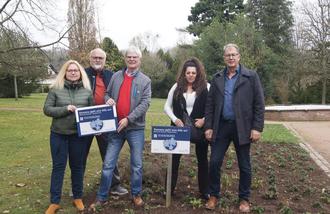 Von links: Margaretha Zboch vom Gerontopsychiatrischen Netzwerk Demenz des Saarpfalz-Kreises, der Seniorenbeauftragte Heinz Schöndorf, die Behindertenbeauftragten Wolfgang Giffel und Carmen Geraci gemeinsam mit Bürgermeister Bernd Hertzler vor dem Vergissmeinnicht-Beet im Klostergarten. (Foto: Uwe Brengel)