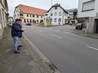 Ben und Thomas Schmitt bei der Prüfung der vom Ortsrat beantragten Tempo 30 Zone.