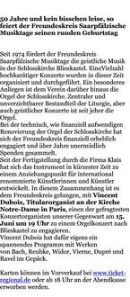 | 15.06.2024 | Orgelkonzert mit Vincent Dubois in der Schlosskirche Blieskastel |