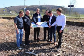 Der Plan für die Dorfmitte von Bierbach ist fertig. Hier sollen ein neues Feuerwehrhaus und ein paar Bauplätze entstehen, auch der Dorfplatz wird neu gestaltet. Über den Stand der Planungen informierten sich Ortsvorsteher Daniel Laborenz, der stellvertretende städtische Wehrführer Oliver Schommers, Bürgermeister Bernd Hertzler, Stadtwehrführer Marco Nehlig, Beigeordneter Patrick Hüther und Baudezernent Tobias Kohl (von links).