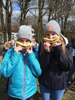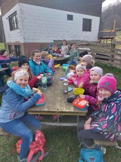 Nach dem Mittagessen hatten die Kinder etwas Zeit für Freispiel oder einen Besuch im Kuhstall. Zurück an der Feuerstelle wurde der Nachtisch vorbereitet. Zum Abschluss gab es eine leckere Schokobanane, welche direkt in die Glut gelegt wurde, bis die Schokolade im Inneren ganz flüssig war. - LECKER!
