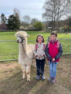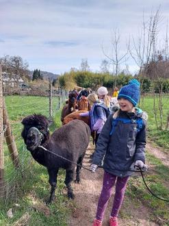 Unterwegs mit flauschiger Begleitung. Am Gründonnerstag machten sich 22 Kinder auf den Weg nach Saarbrücken zur Alpakawanderung. Treffpunkt war der Bahnhof in Lautzkirchen. Von dort aus ging es mit der Regionalbahn bis zum Saarbrücker Hauptbahnhof, von dort weiter mit dem Bus Richtung Tabaksweiher. Nach einem kurzen Fußmarsch durchs Almet gelangten wir zur Saar Alpaka Farm. Schon aus der Ferne entdeckten die Kinder die Lamas und Alpakas auf der Weide. Vor der Wanderung hatten die Kids Zeit, sich noch einmal zu stärken und dabei die Tiere beim Grasen zu beobachten. Nach einer kurzen Begrüßung und Einführung durch die Inhaber der Saar Alpaka Farm Christiane Groß und Rainer Frenkel, ging es direkt auf die Weide zu den Wandertieren. Mit Unterstützung der Kinder wurden hier die Tiere zusammengetrieben, um sie dann für die Wanderung zu halftern. Danach ging es direkt los auf eine Runde durch das schöne Almet und den angrenzenden Stiftswald. Mit vierbeinigem Wanderfreund an der Seite machte das Wandern viel Spaß und die Zeit verging wie im Flug.