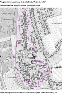 Im nachfolgend näher beschriebenen Gebiet liegen städtebauliche Missstände vor. Dieser Bereich soll durch städtebauliche Sanierungsmaßnahmen wesentlich verbessert oder umgestaltet werden. Das insgesamt etwa 12,2 ha Hektar umfassende Gebiet wird hierfür förmlich als Sanierungsgebiet festgelegt und erhält die Bezeichnung „Ortsmitte Breitfurt“.