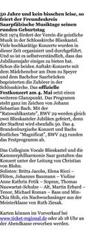 | 04.05.2024 | Schlosskirche Festkonzert mit dem „Collegium Vocale“ in der Schlosskirche 50 Jahre Stadtrat Blieskastel & 50 Jahre Freundeskreis SMT |