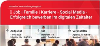 Am 14. Mai bietet die Agentur für Arbeit Saarland eine Online-Veranstaltung im Rahmen der Vortragsreihe „Job | Familie | Karriere“ zum Thema Social Media an. Sie beginnt um 9 Uhr und dauert rund zwei Stunden.