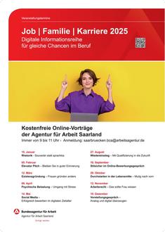 „Job | Familie | Karriere“ ist eine Vortragsreihe, die aktuelle Themen aus der Arbeitswelt behandelt. Interessierte aller Alters- und Berufsgruppen, die erwerbstätig sind oder sein möchten, sind zur Teilnahme eingeladen, auch wenn sie bisher noch nicht in Kontakt mit der Agentur für Arbeit stehen.