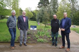 Von links: Der Behindertenbeauftragte Wolfgang Giffel und der Seniorenbeauftragte Heinz Schöndorf besuchten gemeinsam mit Stefan Gries vom städtischen Gärtnerteam und Bürgermeister Bernd Hertzler das Vergissmeinnicht-Beet im Klostergarten.