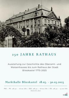 Seit 250 Jahren prägt das Rathaus am Paradeplatz das Blieskasteler Stadtbild. Zu diesem besonderen Jubiläum wird in der Zeit vom 18. bis 30. Mai 2025 eine Ausstellung zur Geschichte des einstigen Oberamt- und Waisenhauses in der historischen Markthalle gezeigt. Werfen Sie einen Blick auf seine Entstehungszeit sowie auf die verschiedenen Einrichtungen und Menschen, die das Gebäude über die Jahrhunderte unter seinem Dach beherbergte.
