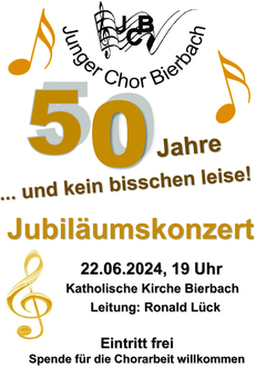 | 22.06.2024 | 50 Jahre Jubiläumskonzert Junger Chor Bierbach in der Katholischen Kirche Bierbach |
