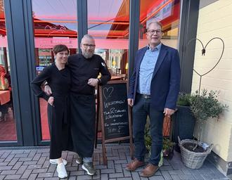 Das frischgebackene Pächter-Ehepaar Tina und Daniel Kaufmann mit Verwaltungschef Bernd Hertzler vor dem Eingang zum Gasthaus. (Foto: C. Hertzler)