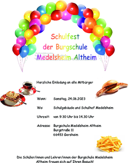 Am 24.06.2023 Uhr findet im Schulgebäude und auf dem Schulhof der Grundschule Medelsheim Altheim das diesjährige Schulfest statt. Von 9:30 Uhr bis 14.30 Uhr können Sie sich auf ein buntes Programm freuen. Für die Kinder werden verschiedene Spielestationen angeboten. Selbstverständlich ist auch für das leibliche Wohl gesorgt. Von Pommes und Würstchen bis zu Torten und Kuchen, Kaffee und Kaltgetränken ist alles für ein gelungenes Schulfest vorbereitet. Wir freuen uns auf Ihren Besuch.