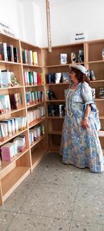 Gesellschaftsdame Anna Maria de Moranville ließ es sich nicht nehmen der Bücherei in den neuen Räumen, in der Kardinal-Wendel-Str.17, einen Besuch abzustatten. Sichtlich angetan von den neuen Büchern, verweilte sie vor den Regalen.