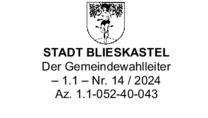 | 2. | Die Stadt Blieskastel ist in 27 allgemeine Wahlbezirke eingeteilt. In den Wahlbenachrichtigungen, die den Wahlberechtigten in der Zeit vom 30.04. bis 19.05.2024 übersandt worden sind, sind die Wahlbezirke und die Wahlräume angegeben, in denen die Wahlberechtigten zu wählen haben. Die Briefwahlvorstände treten zur Ermittlung des Briefwahlergebnisses um 14:00 Uhr im Rathaus I, Dienstzimmern 101, 104, 105 und 110, Paradeplatz 5, Blieskastel-Mitte, zusammen. |