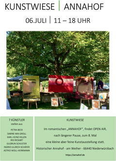 8 Künstler stellen am 06. Juli 2025 von 11 – 18 Uhr auf der Gartenterrasse des „Annahof“ aus. Es erwarten Sie: Petra Beck, Mia Sabine Groll, Karl-Heinz Hillen, Iris Rickart, Gudrun Schuster,