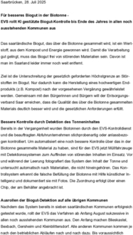Bereits in der Vergangenheit wurden Biotonnen durch den EVS-Kontrolldienst und die beauftragten Abfuhrunternehmen stichprobenartig oder anlassbezogen kontrolliert. Um automatisiert eine noch bessere Kontrolle über das in der Biotonne gesammelte Material zu haben, sind für den EVS jetzt Müllfahrzeuge mit Detektionssystemen zum Auffinden von störenden Inhalten im Einsatz. Vor und während der Leerung fotografiert das System den Inhalt der Tonne und untersucht automatisch nach Materialien, die nicht hineingehören. Das Kontrollsystem erkennt die falsche Befüllung der Biotonne mit Hilfe künstlicher Intelligenz und dokumentiert sie mit Fotos. Die Zuordnung erfolgt über einen Chip, der am Behälter angebracht ist.
